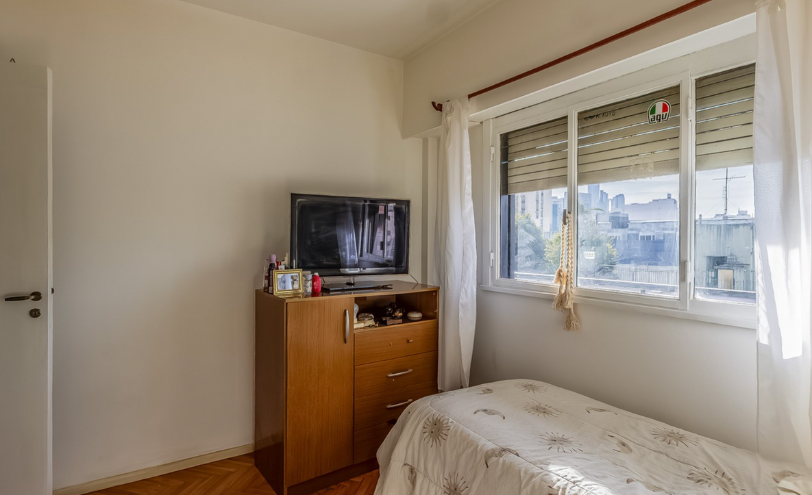 Three-room apartment with a front-facing balcony offering a great open view. It features a living-dining room, a kitchen with a washing machine, a full bathroom, and two bedrooms. The building is located one block from Plaza Dorrego and one block from San Juan Avenue.